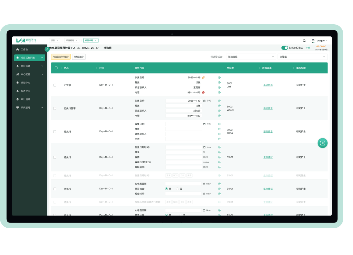 受试者个人单的在进行数据采集时,支持切换集中采集模式,便于用户查看和采集项目横向和受试者纵向维度的信息。