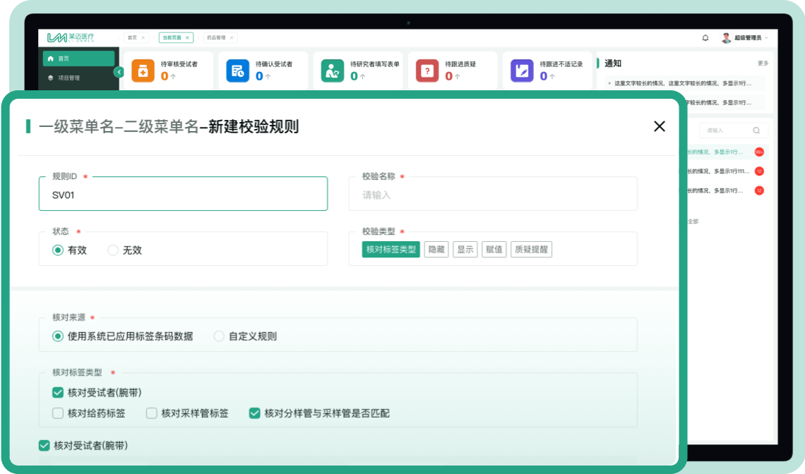 支持受试者腕带、样本、药品标签的设计和打印,并在数据采集过程中核验受试者身份、药品标签、样本标签。
